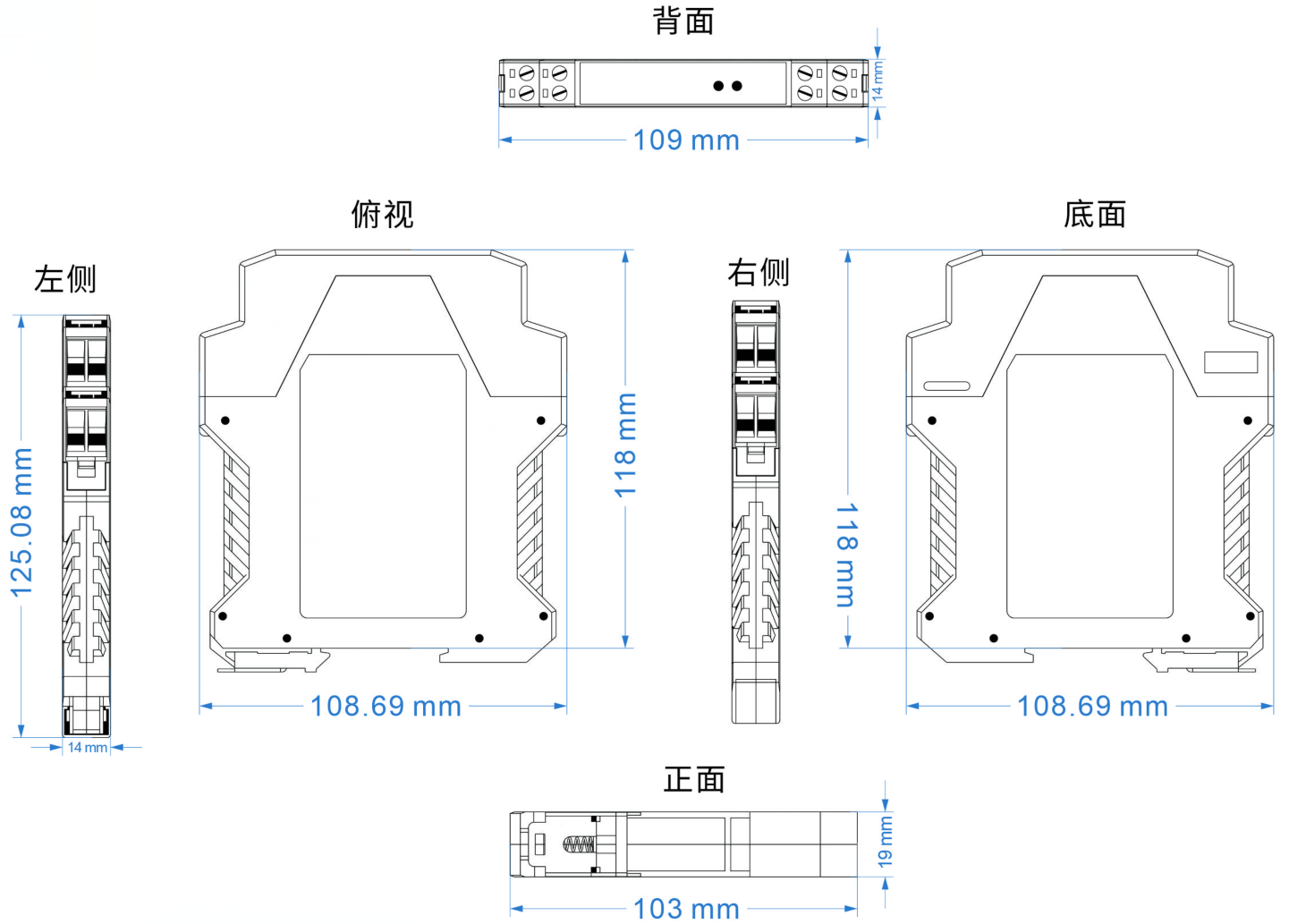 尺寸:97mm(長) x 54mm(寬) x 32mm(高) 安裝方式:35mm導(dǎo)軌安裝、壁掛式安裝 |