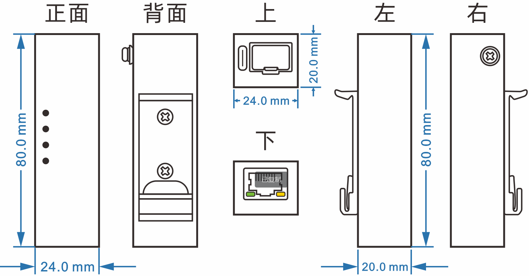 外殼:IP40防護等級 尺寸:24mm(長) x 80mm(寬) x 20mm(高) 安裝方式:導軌安裝、壁掛式安裝 |